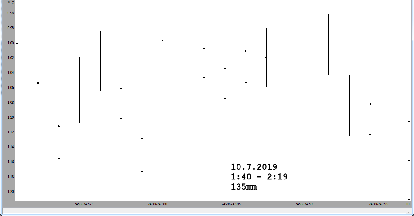 Pro Stunde liegt die Änderung bei etwa 0,05 mag. Die Messung dauerte am 7.7.2019 etwas über eine Stunde. Ein passender Trend ist in den Daten zu erkennen. Der Abstand zu den 3 Vergleichsssternen liegt zu Beginn bei 1,25mag.