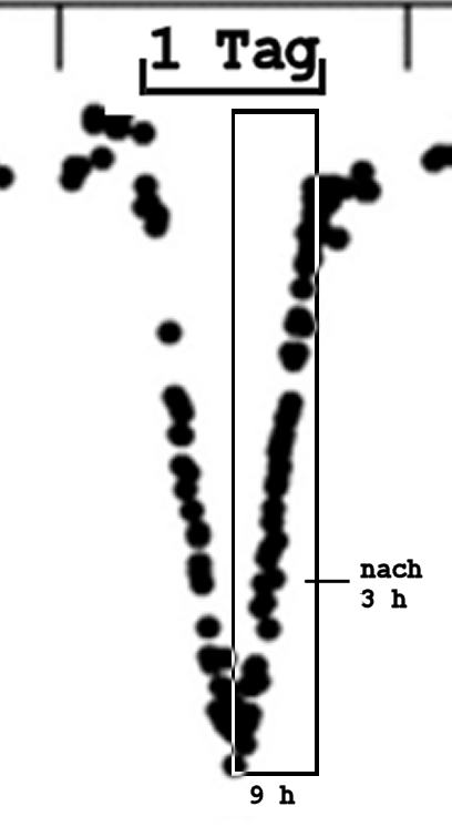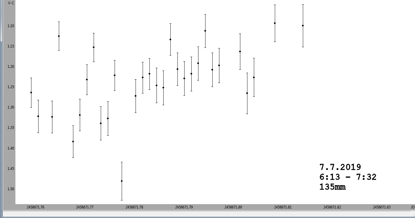 Die einzige halbwegs erfolgreiche Messung gelang am 7.7.2019. Allerdings wurde erst zu spät gestartet. Das Minimum war zu Beginn der Messung schon 2:45 min vorüber. Da aber für den Anstieg 9 Stunden benötigt werden, sollte nach 3 Stunden der Lichtabfall immer noch 0,27 mag betragen.