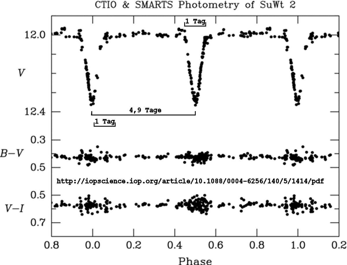 Der PK-Katalog von Lubos Kohoutek gilt als Standardkatalog für PNs. Der Hauptkatalog besitzt einige Unterkataloge, von denen sich einer mit doppelten Zentralsternen beschäftigt. Dort sind nur 3 Zentralsterne als Bedeckungsveränderliche eingetragen. Alle 3 zeigen eine extreme Amplitude in sehr kurzer Zeit, so dass die große Oberflächenhelligkeit und der geringe Durchmesser in der Kurve schön demonstriert werden kann. Ein vierter, bei Kouhoutek nicht verzeichneter bedeckungsveränderlicher Zentralstern ist SuWt2. Das Objekt steht für Europa unbeobachtbar am Südhimmel.