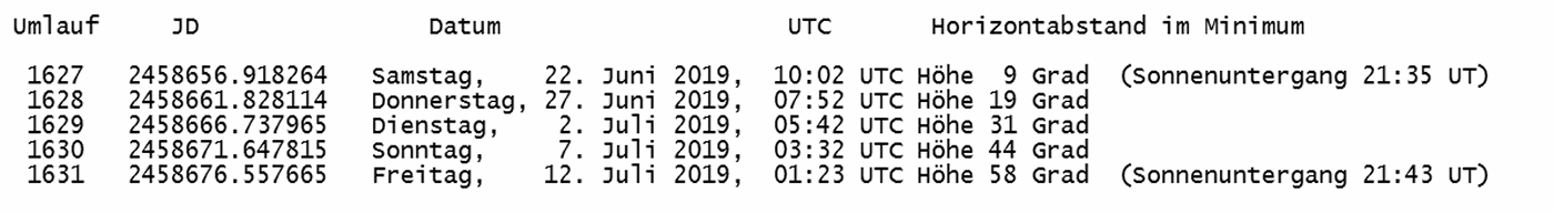 Folgende Minima ergaben sich für den Reisezeitraum: