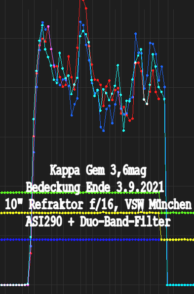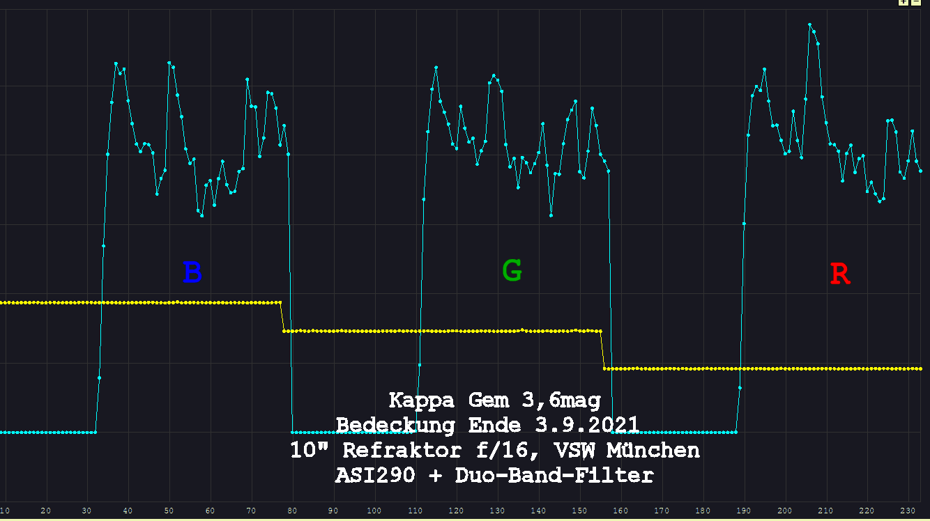 Das Ende der Bedeckung konnte unter besten Bedingungen aufgezeichnet werden. Die Kanäle wurden zerlegt. Die Photometrie von Grün und Blau sollten eigentlich sehr ähnlich sein da die blaugrüne Linie bei 500nm in beide Filterbereiche fällt. Die Abweichungen sind tatsächlich gering und daran läßt sich das Rauschen abschätzen.