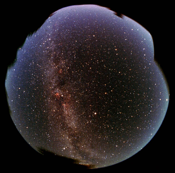 Während unsere Milchstraße von oben die bekannte Spiralform aufweist, gleicht sie von der Seite eher einem Diskus oder 2 aufeinander gelegten Suppentellern mit einem schwarzen Staubband als Abstandshalter. Die weißen Punkte sind die Kugelsternhaufen, die das Zentrum der Milchstraße umkreisen.