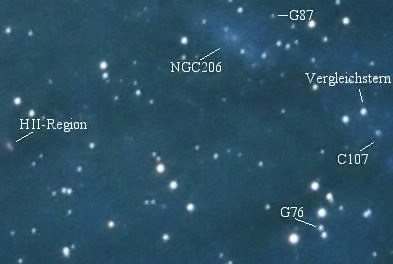 Einzelstruktur ist NGC206. Sie kann auch schon in kleinen Fernrohren gut erkannt werden.