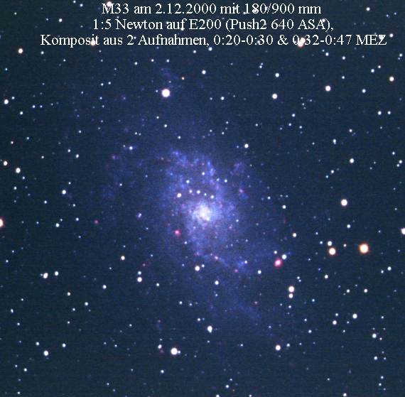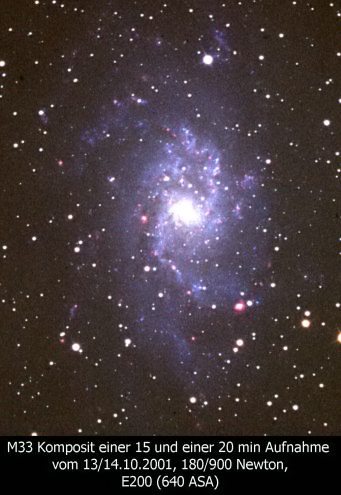 Der uns zweitnächste große Galaxie ist M33. Aehnlich wie bei M101 schauen wir fast genau von oben