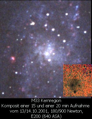 Auf der Ausschnittsvergrößerung unten rechts sind die beiden hellsten HII-Gebiete abgebildet.