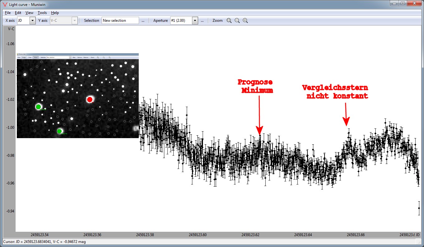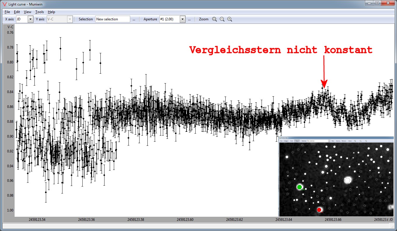Bei der Messung vom 30.9.2020 wurde nicht bedacht, dass der Zielstern eigentlich die schwache Komponete neben dem hellen Stern ist. Aus Gewohnheit wurde unscharf gestellt und so wurden beide Sterne erfasst. Die Amplitude fiel dadurch kleiner aus, ist aber immer noch sichtbar.