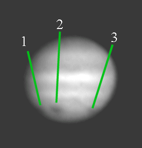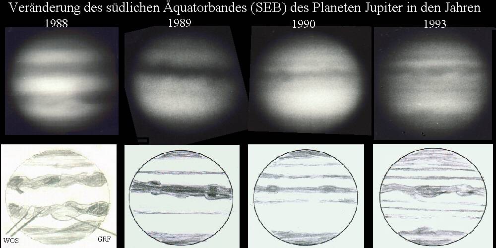 Die ständigen Änderungen in den Stürmen machen den Jupiter zu einem besonders interessanten Beobachtungsobjekt. Gelegentlich kommt es sogar zu großräumigen Strukturänderungen. So verschwand Ende der 80´er Jahre das Südliche Äquatorband (SEB) fast vollständig. Zuvor hatte es über mehrere Dekaden keine Änderung dieses Ausmaßes gegeben! Erst ab 1992/93 erfolgte eine langsame Restauration. (66 kb)