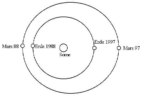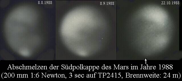 Neben den gelegentlichen Staubstürmen, ist das Anwachsen und Abschwellen der Polkappen die augenfälligste Veränderung während des Marsjahres. (Bild Unten 23 kb) Leider ist der Mars nicht immer gut zu beobachten. Im Gegensatz zur Erde besitzt er eine recht elliptische Umlaufbahn. Die Folgen verdeutlicht die Aufnahme rechts. (3 kb) Bei schlechten Marsopositionen wie z.B. in 1997 ist der Planet doppelt soweit entfernt wie in guten Marsjahren. Bei einer günstigen Oppositionen besitzt das Fernrohrbild dagegen eine fast 4-mal so