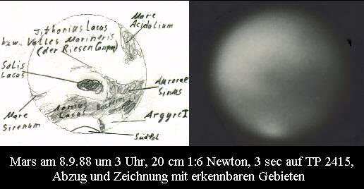 zweite Erde ist. Die Atmosphäre hat nur 0,6 Prozent des Erdruckes, die Temperatur liegt selten über der 0-Grad-Grenze, flüssiges Wasser gibt es nicht (mehr), Die Polkappen bestehen fast nur aus Kohlendioxid. Leben gibt es trotz neuerer Diskussionen wahrscheinlich nicht! Trotzdem ist Mars ein immer noch interessantes Beobachtungsobjekt. Die schon im kleinen Teleskop sichtbare rote Farbe hat ihre Ursache im hohen Eisen(rost)anteil des Bodens. Auf der Oberfläche sind zahlreiche Strukturen zu erkennen. Die untere Aufnahme aus dem Jahr 1988 (24 kb) mit beigefügter Zeichnung verdeutlicht dies.