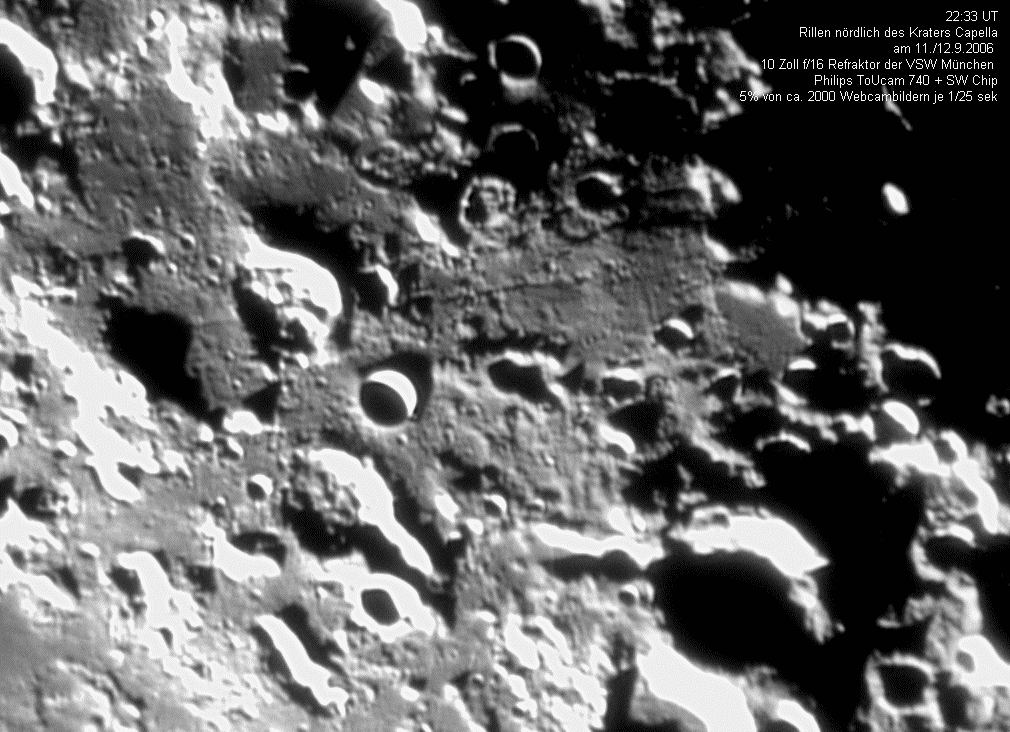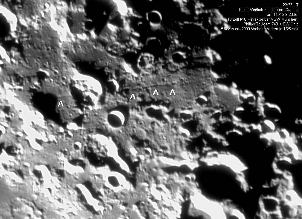 Erstes Ziel war eine schwache Rille nördlich des Kraters Capella.