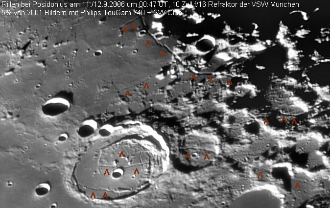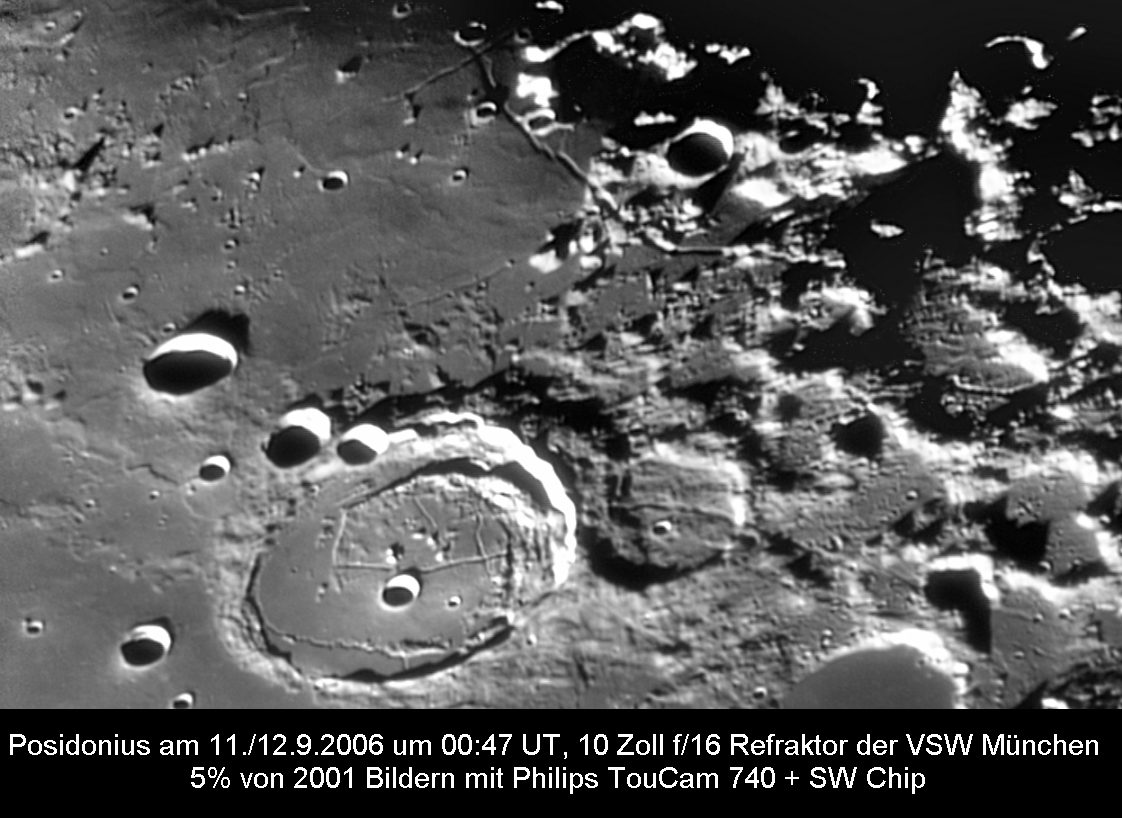 Leichter zu erkennen sind die Rillen am Boden des Kraters Posidonius.