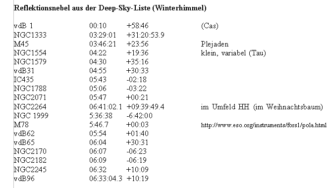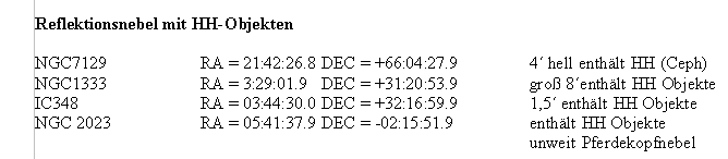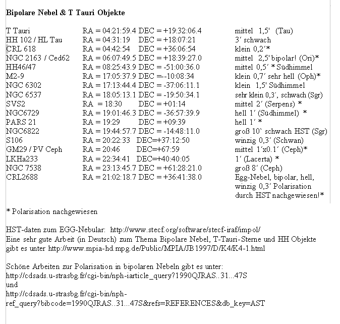 Nach dem erfolgreichen Nachweiß von polarisierten Licht in NGC2261 wurde bei der Auswahl ein Schwerpunkt auf Bipolare Nebel gelegt. Weil bei mehreren Sternen die Gefahr einer gegenseitigen Neutralisation besteht, wurden bei den Reflektionsnebeln Objekte