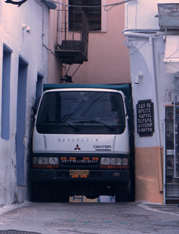 Die Straßen in der Inselhauptstadt Ioulis sind extrem eng und Autos müssen auf den Millimeter genau gesteuert werden.