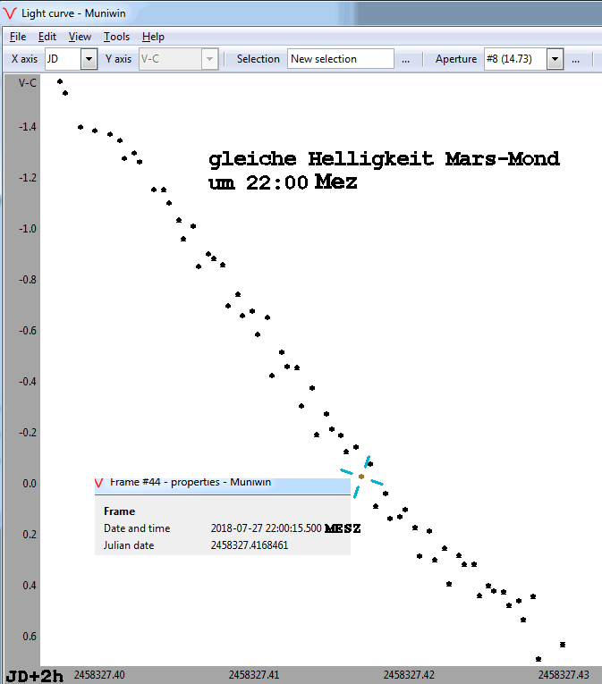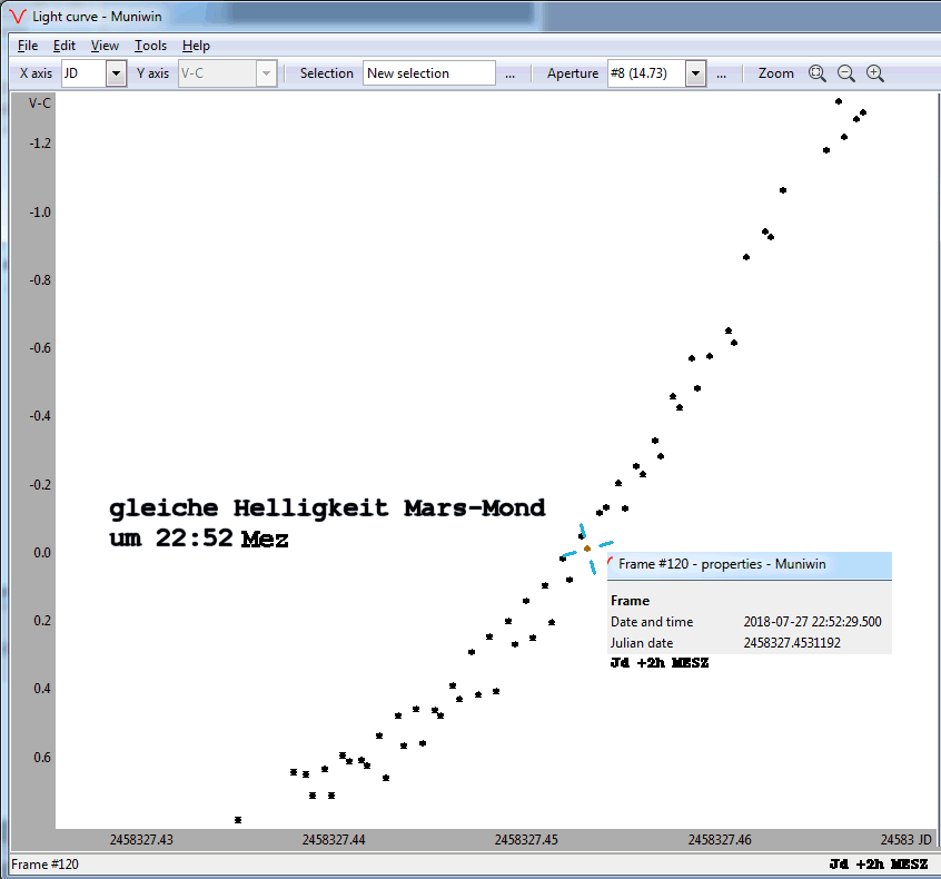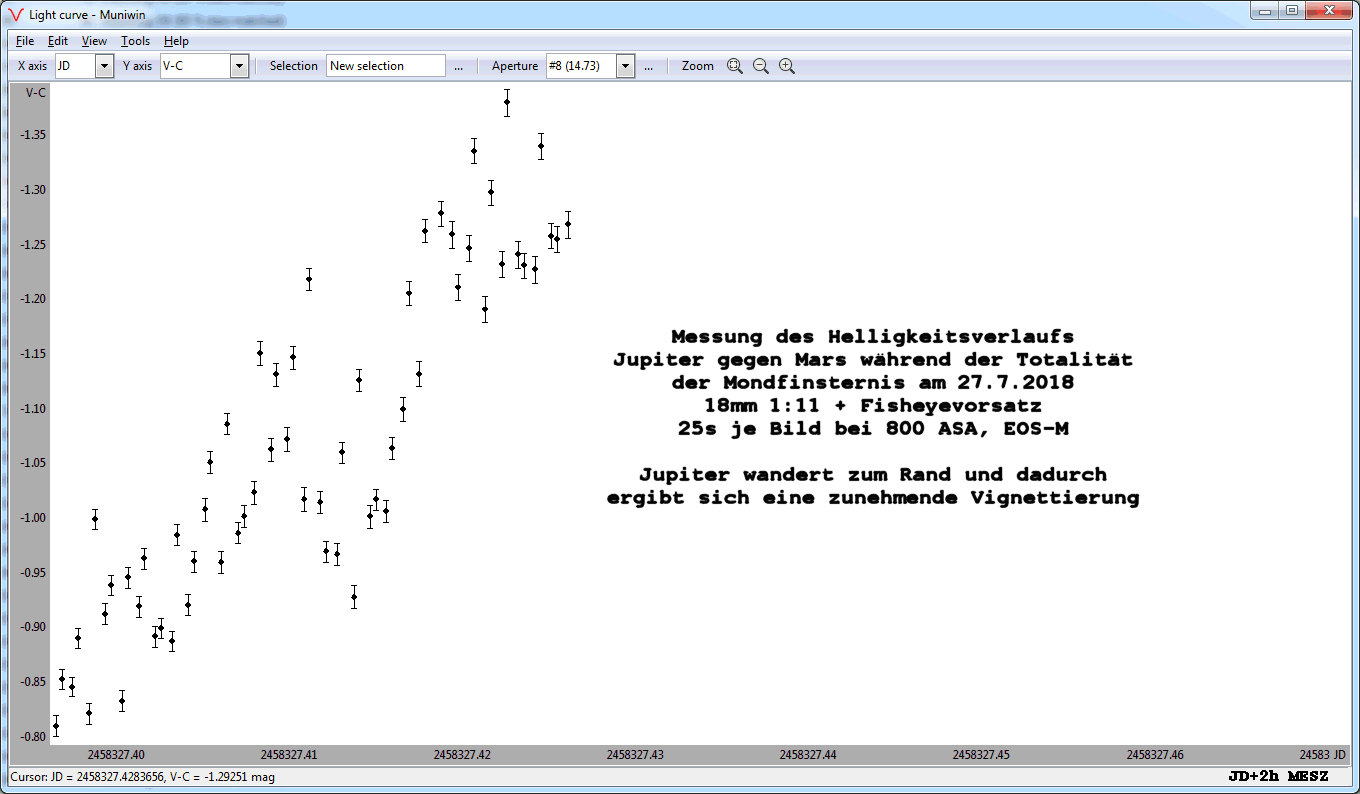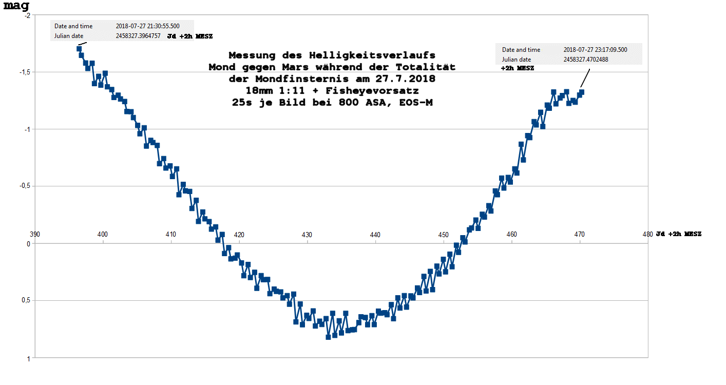 Um die Skalierung zu prüfen wird neben Mars und Mond noch ein drittes Objekt benötigt. Dazu wurde Jupiter verwendet, der jedoch im Laufe der Finsternis unterging und daher zum Rand des Gesichtsfelds wanderte. Dadurch befand sich der Planet im vignettierten Bereich was die Datenauswertung erschwerte. Es wurde jedoch eine Differenz zwischen den Planeten von 0,8mag gemessen was gut zu den Jahrbuch-Werten passt.