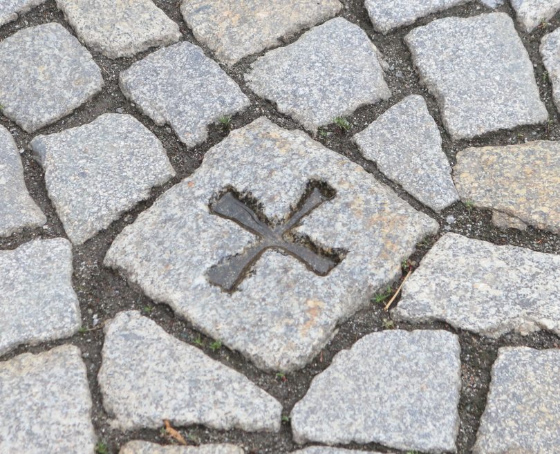Im Pflaster vor dem Hauptmarkt findet man 2 Kreuze. Hier stand das