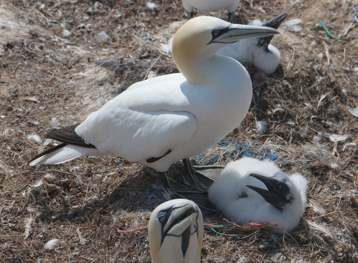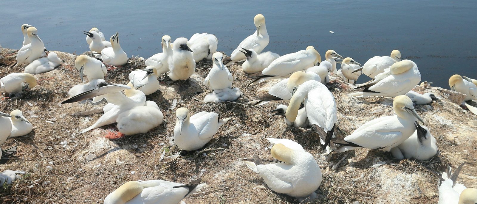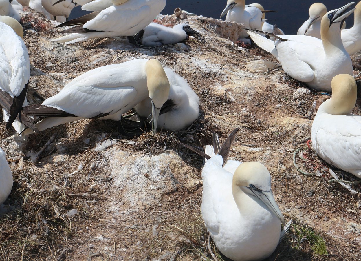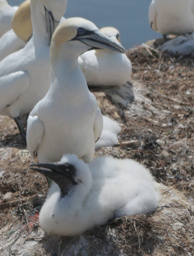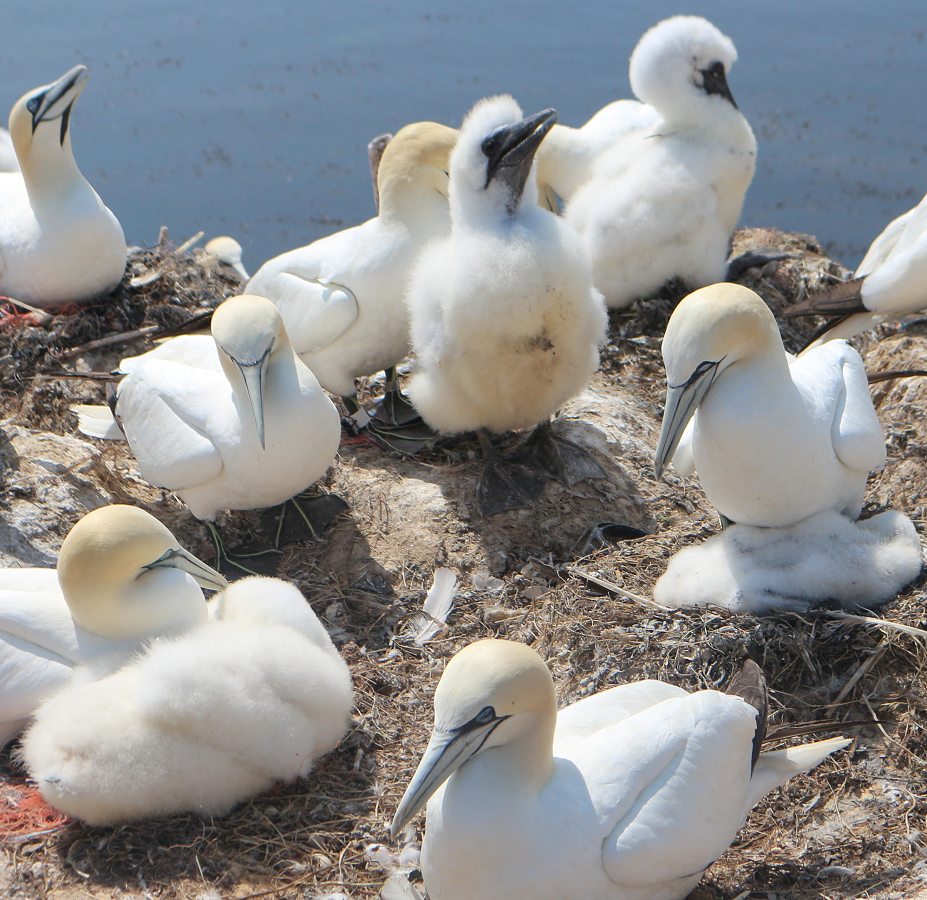 flaumiges Kleid und saß in den Nestern. Auf dem Vogelfelsen