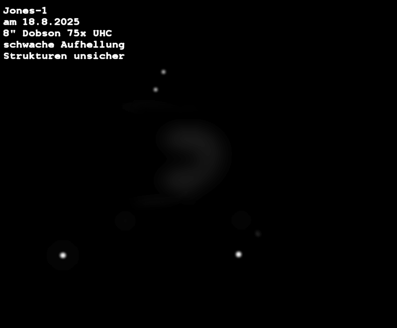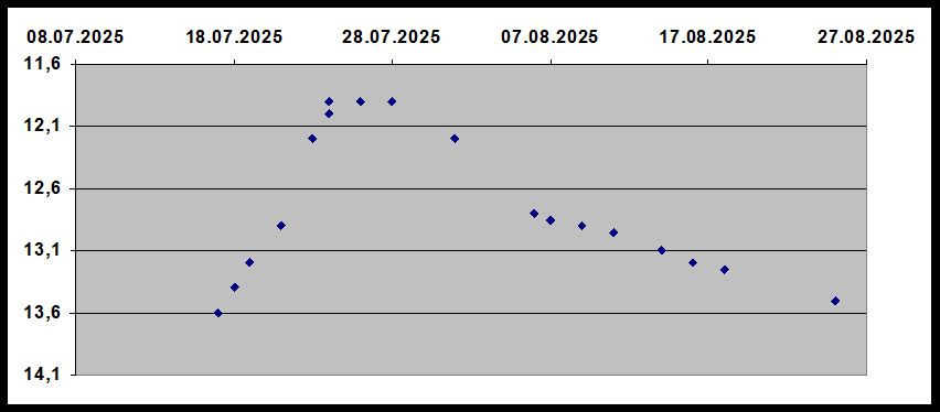 Ende Juli pendelte sie um 12,0 mag. Am 18.8.25 war sie etwa 1,5 mag