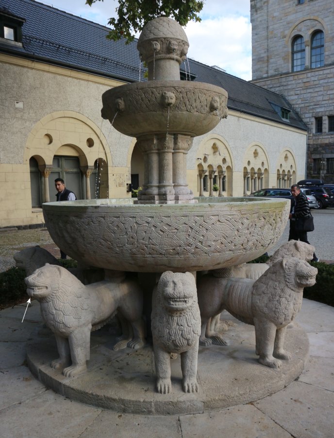 Löwenbrunnen - Einer der Löwen steckt die Zunge raus.