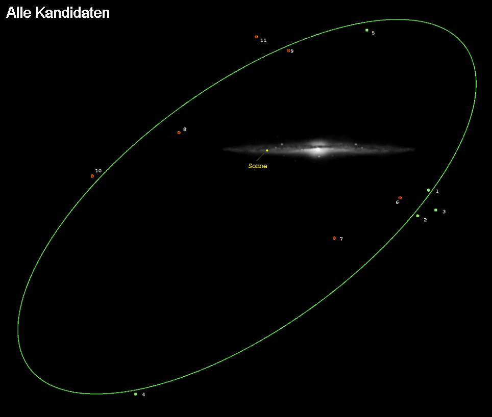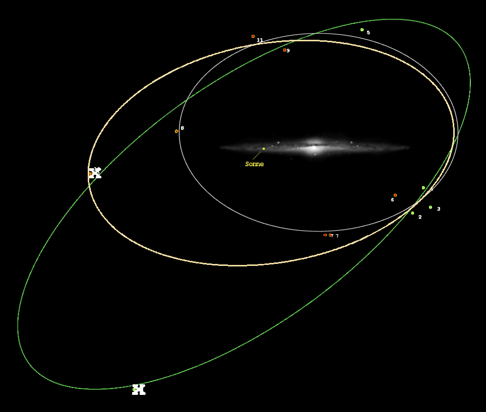 1) Das Zentrum der Milchstraße steht in einem der Brennpunkte. Das spricht dafür, dass