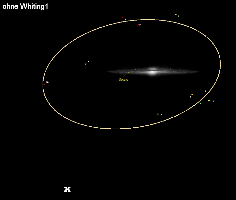 Man würde eine Verteilung der Kugelsternhaufen entlang einer elliptischen Bahn vermuten.