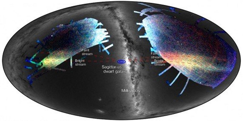 Die Gezeitenkräfte haben die Sterne des Sagittarius-Dwarf auf einem Sternstrom verteilt. Es gibt da Ähnlichkeiten