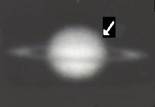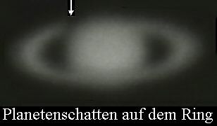 Wenn die Erde außerhalb der Linie Sonne-Saturn steht, kann der Schatten des Planeten auf dem Ring gesehen werden (Pfeil auf dem linken Foto vom 30.8.91, 200 mm 1:6 Newton, TP 2415 hyp.) Saturn ist recht schwierig zu fotografieren. Wegen seiner großen Sonnendistanz von 1,4 Milliarden Kilometern ist er relativ lichtschwach - während der langen Belichtungszeiten (auf herkömmlichen Film sind dies oft mehr als 15 Sekunden) wird das Bild durch die Luftunruhe verschmiert. Unter guten Bedingungen zeigt Saturn Streifenstrukturen ähnlich dem ihm im Aufbau verwandten Jupiter. Auf dem mittleren Foto (Pfeil) ist andeutungsweise ein solcher Atmosphärenstreifen zu erkennen. (16.8.94 200 mm 1:6 Newton bei 12 m Brennweite, 10 sec auf TP 2515. Entwickelt 25 min in Rodinal bei 20 Grad) Auffällig ist auch die Abplattung der Planetenscheibe. Sie entsteht durch Fliehkräfte am Äquator des Planeten. Der Großplanet mit 95 Erdmassen dreht sich in nur 10 Stunden um die eigene Achse.