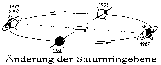 Die Achse des Saturns ist gegenüber seiner Sonnenbahn geneigt. Der Effekt ist ähnlich auch bei der Erde vorhanden und führt zur Entstehung der Jahreszeiten. Der Saturn umkreist die Sonne in ca. 30 Jahren. Während dieser Zeit ist der Ring 2 mal maximal geöffnet und 2 mal nur von der Kante zu sehen. Die Kante ist nur wenige Kilometer dick und kann bei der Aufnahme aus dem Jahre 1995 nicht aufgelöst werden. Es ist jedoch der Schatten des Rings als dunkler Streifen auf dem Planeten zu erkennen . (21 kb)