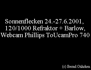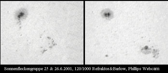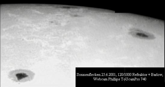 Besonders gelungen ist die obige Aufnahme vom 21.6.2001. An diesem Tag fand im südlichen Afrika eine totale Sonnenfinsternis statt. Auch am 22.6. war das Seeing gut. Doch wie auf der unteren Aufnahme zu erkennen ist,
