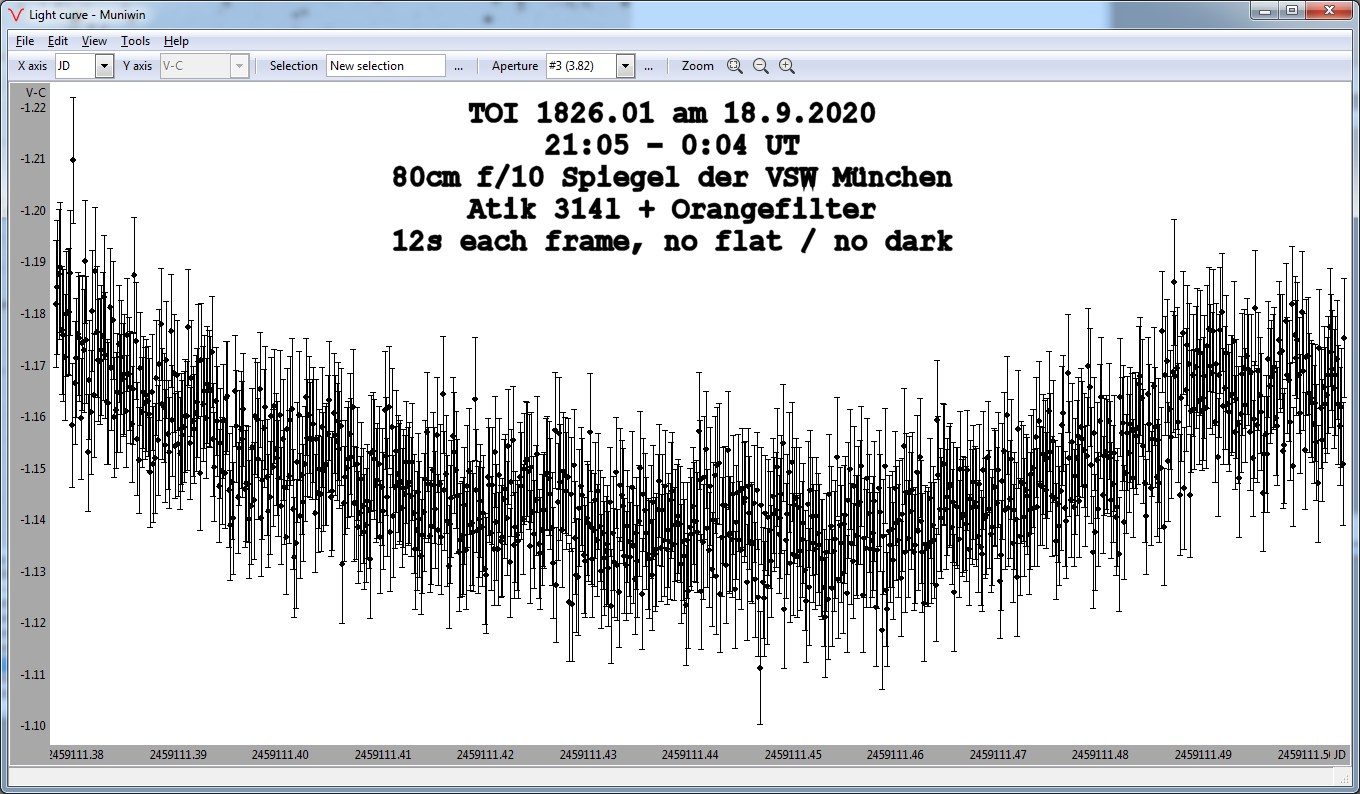 Die Messung erfolgte gegen einen etwas schwächeren Stern neben dem Exo-Kandidaten. Der Einbezug von Sternen im weiteren Umfeld brachte keine Verbesserung. Es war jedoch möglich mit diesen Sternen eine ausreichende Konstanz des Vergleichssterns zu testen.
